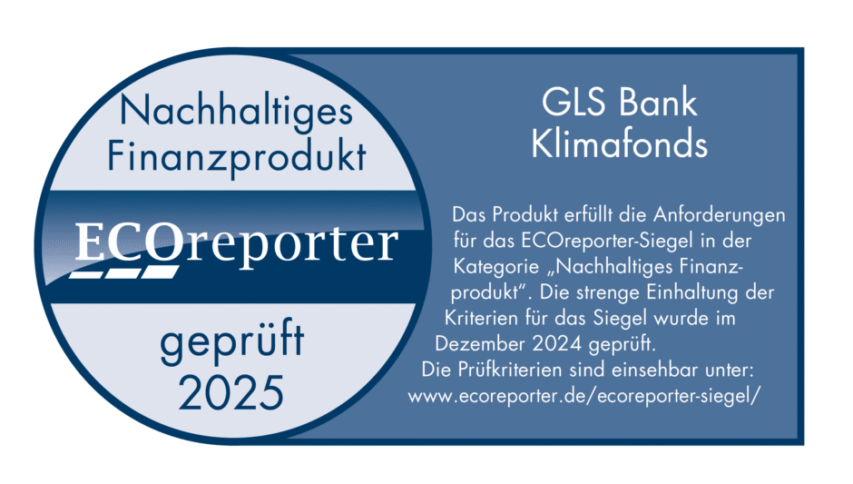 Der GLS Bank Klimafonds erhielt vom ECOreporter die Nachhaltigkeitsnote 1,3 und trägt das ECOreporter-Nachhaltigkeitssiegel. Der ECOreporter attestiert: Der GLS Bank Klimafonds gehört zu den nachhaltigsten geprüften Fonds am Markt.