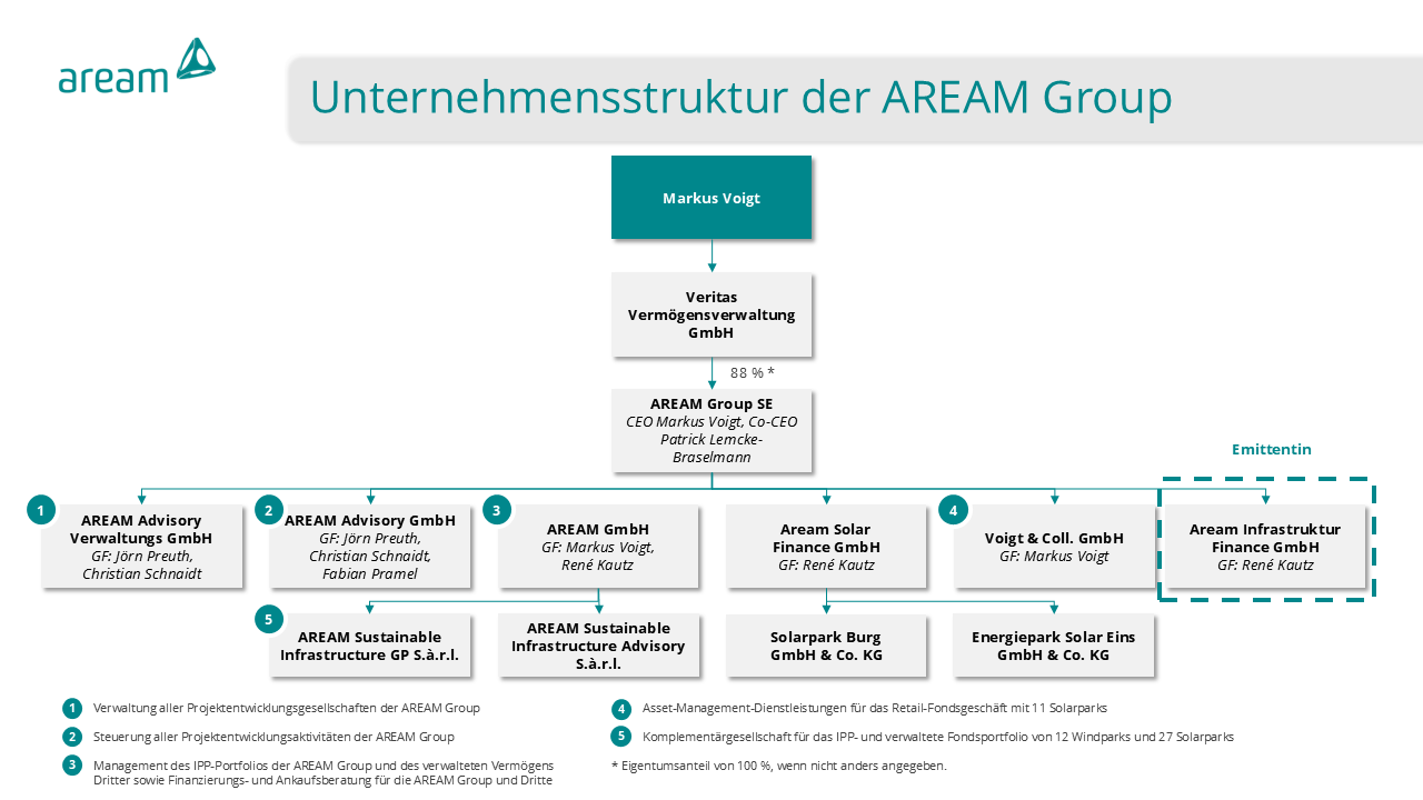 Emittentin ist die Aream Infrastruktur Finance GmbH, eine 100%ige Tochtergesellschaft der AREAM Group SE. Die 2005 gegründete AREAM Group SE ist ein Kompetenzzentrum für institutionelle Investoren, Industriekunden und Energieerzeuger mit Fokus auf nachhaltige Infrastruktur im Bereich Erneuerbare Energien. Mit den drei Geschäftsfeldern Fund- und Asset-Management, Projektentwicklung sowie Operations- und Energy-Management deckt die Gruppe die gesamte Wertschöpfungskette für Erneuerbare-Energien-Investments ab.