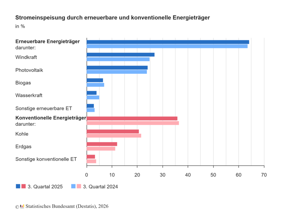 Nach vorläufigen Ergebnissen des Statistischen Bundesamtes wurden im 3. Quartal 2025 in Deutschland 98,3 Milliarden Kilowattstunden Strom erzeugt und in das Netz eingespeist – das waren 2,0 % mehr als im Vorjahresquartal. Die Stromerzeugung aus erneuerbaren Energien erreichte mit einem Anteil von 64,1 % des inländisch produzierten Stroms einen neuen Höchststand für ein drittes Quartal. Im 3. Quartal 2024 hatte der Anteil erneuerbarer Energien bei 63,5 % gelegen. Diese dynamische Entwicklung eröffnet vielfältige Chancen für Investoren.